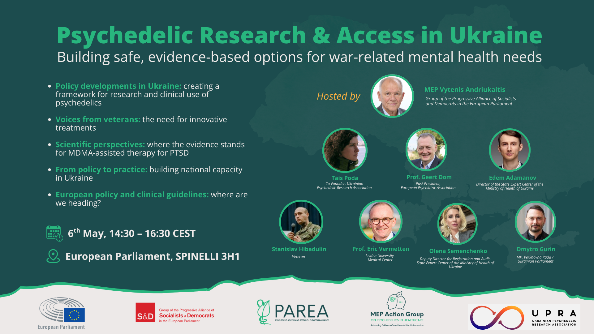 Co-organised by PAREA, the MEP Action Group on Psychedelics in Healthcare, and the Ukrainian Psychedelic Research Association (UPRA), and hosted by S&D MEP Vytenis Andriukaitis, the event will explore how evidence-based psychedelic therapies may contribute to addressing war-related mental health challenges in Ukraine, particularly PTSD among veterans.