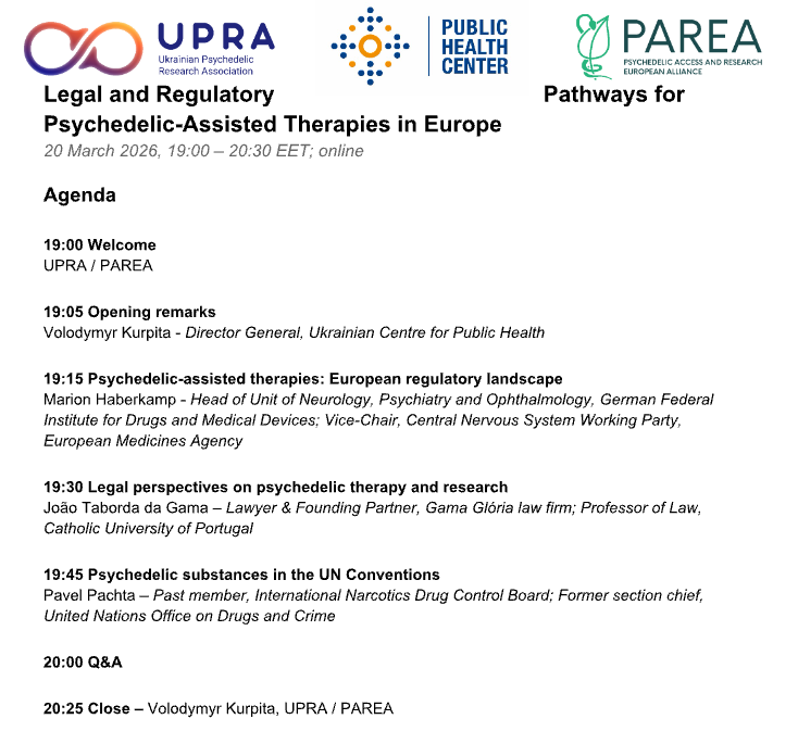 This Friday, March 20, at 18:00 CET, the Public Health Centre of Ukraine and UPRA - Ukrainian Psychedelic Research Association, in partnership with PAREA, are organising an webinar on legal and regulatory frameworks for psychedelic-assisted therapies in Europe.